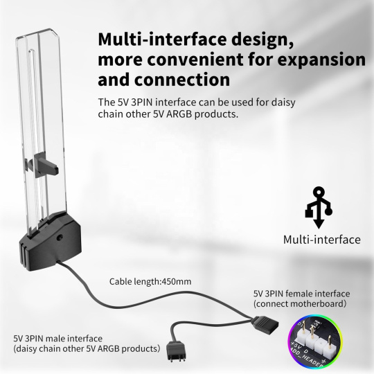 Stylová varianta této opory Vaší grafické karty se sestává z hliníkové základny vybavené magnetem pro snadné uchycení do Vaší PC skříně a akrylátovým stojánkem se stavitelnou podpěrou a podsvícením LED aRGB. Zabraňuje tak prohýbání větších karet ve slotu a dodává sestavě lepší celkovou stabilitu. Toto řešení lze tak jednoduše posunout jak horizontálně tak i vertikálně a umožňuje instalaci v různých místech karty, pro maximální kompatibilitu s většinou karet. Rozměry držáku jsou 200 x 40 x 50mm.
