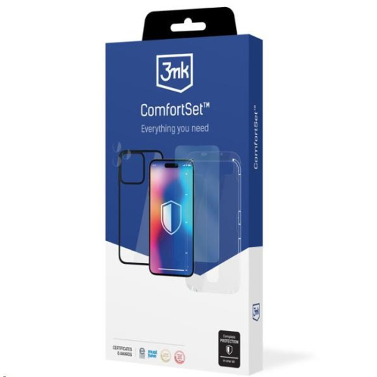 Comfort Set 4in1 je profesionálna sada na samostatné prevedenie komplexnej ochrany chytrého telefónu. Obsahuje vlajkové produkty 3mk Protection: obal Satin Armor Case+, hybridné sklo Resilient Glass na objektív fotoaparátu Lens Protection, tvrdené sklo na displej telefónu s tvrdosťou 9H a jednorazový aplikačný nástroj na inštaláciu skla. Vďaka sade Comfort Set 4in1 ochránite svoj chytrý telefón, aniž by ste museli niekam chodiť. Navyše sa ani príliš netrápite s inštaláciou skla – je to veľmi jednoduché a zvládnete to za niekoľko minút!