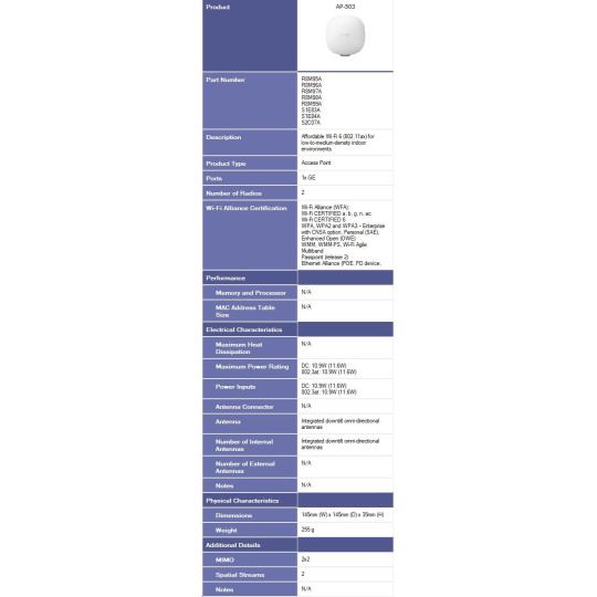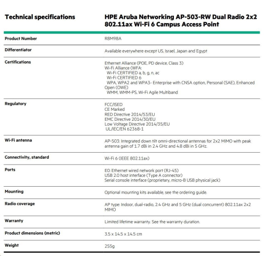 5 x HPE Aruba Networking AP-503-RW Dual Radio 2x2:2 802.11ax Wi-Fi 6 Campus Access Point ( 5x R8M98A )