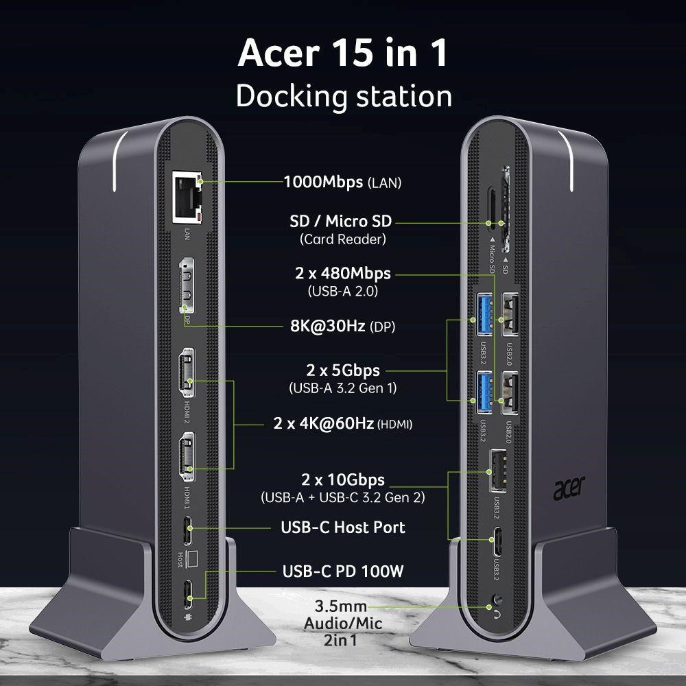 ACER 15in1 USB Type-C Universal Mini-dock: Host interface: USB-C, 2x USB-A 2.0, 1x USB-A 3.2 Gen2, 1x USB-A 3.2 Gen1, 1