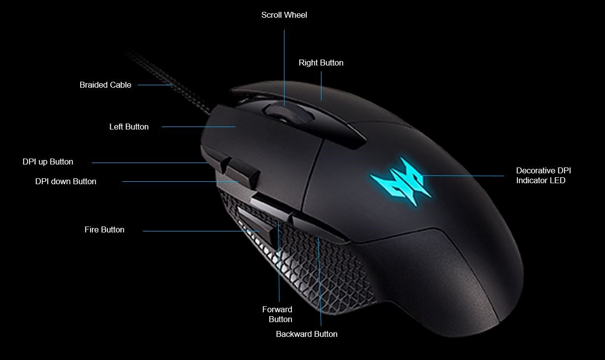 ACER PREDATOR CESTUS 315 - herná myš, 4 úrovne DPI 800-6500dpi, senzor Pixart 3325, IPS/rýchlosť 100, 8 tlačidiel