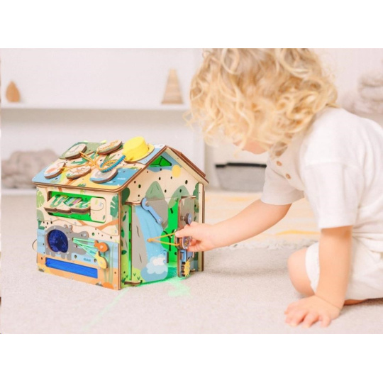 Po zdolaní rôznych otváracích mechanizmov sa deťom podarí otvoriť dvierka do activity board domčeka. V útulnom domčeku môžu ubytovať plyšové zvieratká alebo obľúbené bábiky. Pri otváraní a zatváraní dvierok deti potrénujú jemnú motoriku, koordináciu očí a rúk i logické myslenie.