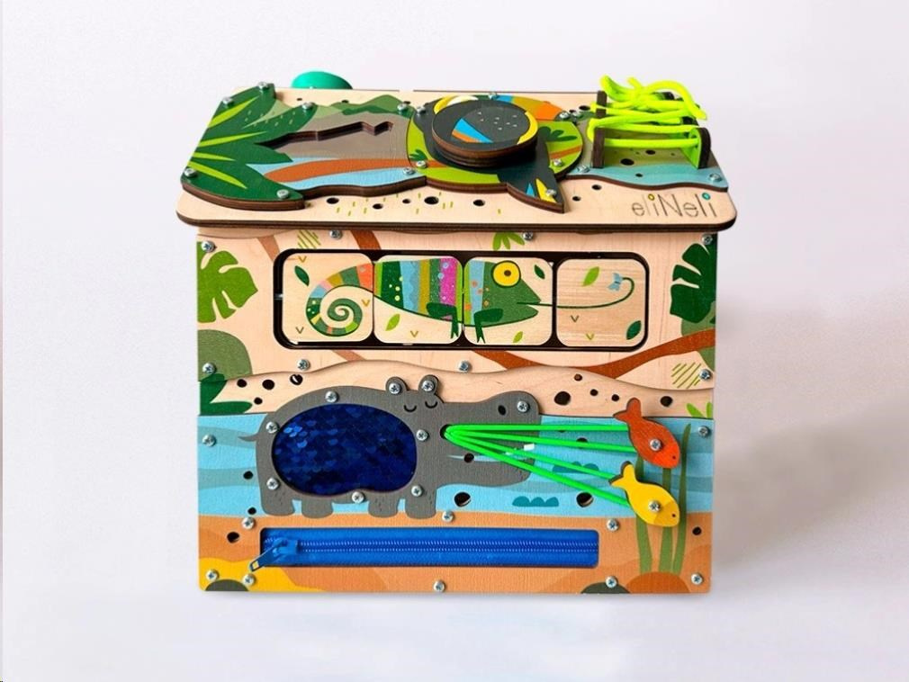 Domček activity board - Safari je tvorené zo šiestej dosky s hracími a montessori prvkami zameranými na zručnosť, logiku, kreativitu a trpezlivosť. Domček vtiahne deti do sveta objavovania a fantázie, kde si deti samé hrajú a učia sa tým najprirodzenejším spôsobom, pomocou hry.