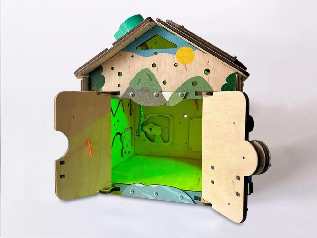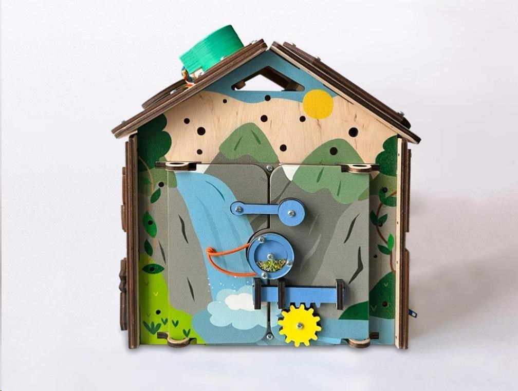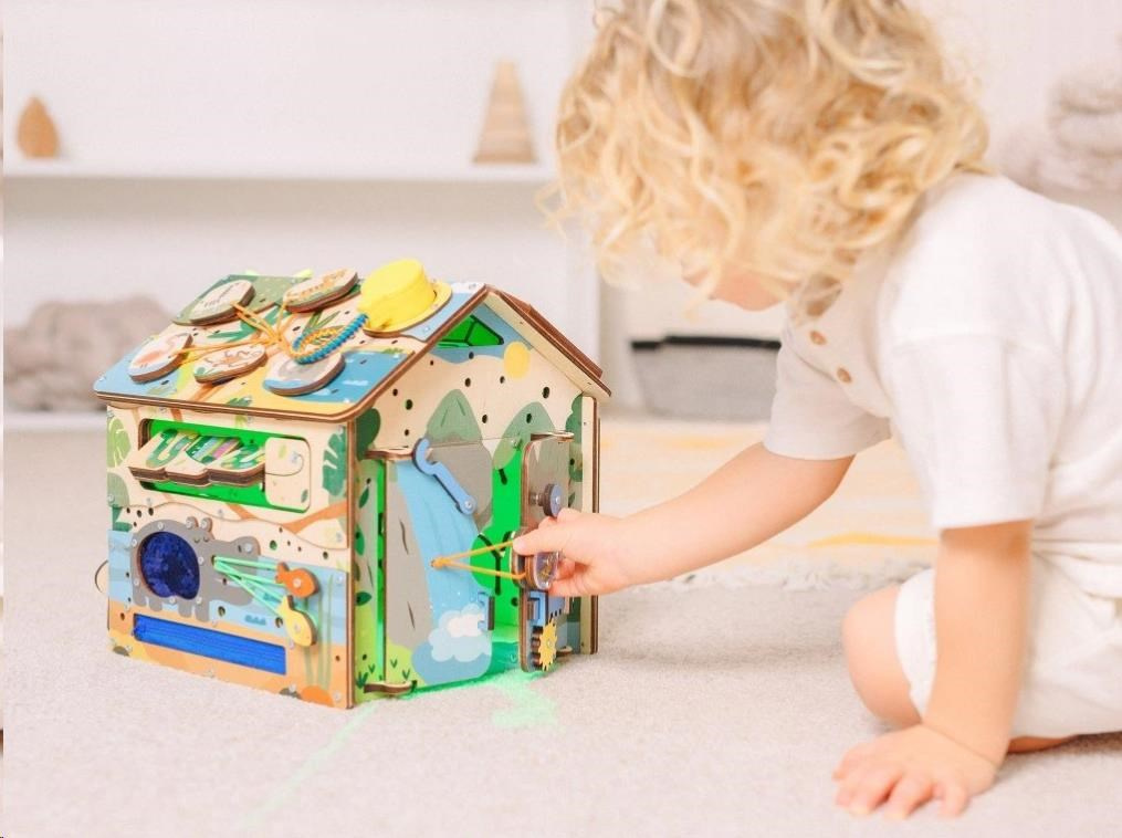 Po zdolaní rôznych otváracích mechanizmov sa deťom podarí otvoriť dvierka do activity board domčeka. V útulnom domčeku môžu ubytovať plyšové zvieratká alebo obľúbené bábiky. Pri otváraní a zatváraní dvierok deti potrénujú jemnú motoriku, koordináciu očí a rúk i logické myslenie.
