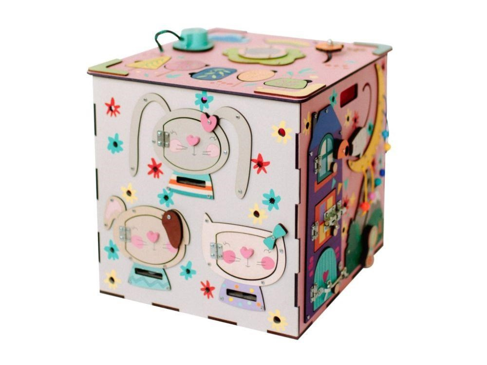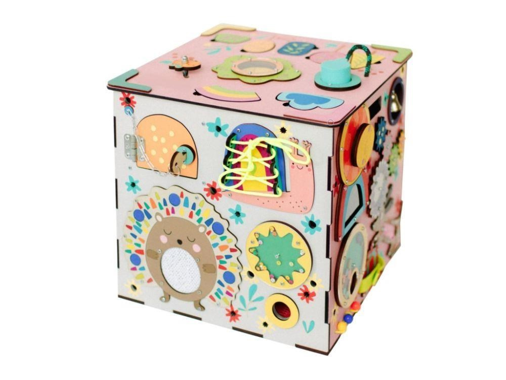 Activity board kostka s LED osvetlením XXL je originálna montessori hračka, ktorá deti zabaví, zdokonalí ich schopnosti a naučí ich novým zručnostiam. Každá strana ružového activity boardu je originálna a ponúka nespočet možností na hru, skúmanie a objavovanie. Nechýbajú ozubené kolieska a kolečka, rôzne spôsoby zapínania, šnúrka, rôzne spôsoby zatvárania, koráliky, bludisko, vkladačky puzzle, rôzne prekvapenia i slnečný vypínač, ktorý activity board kostku rozzáari.