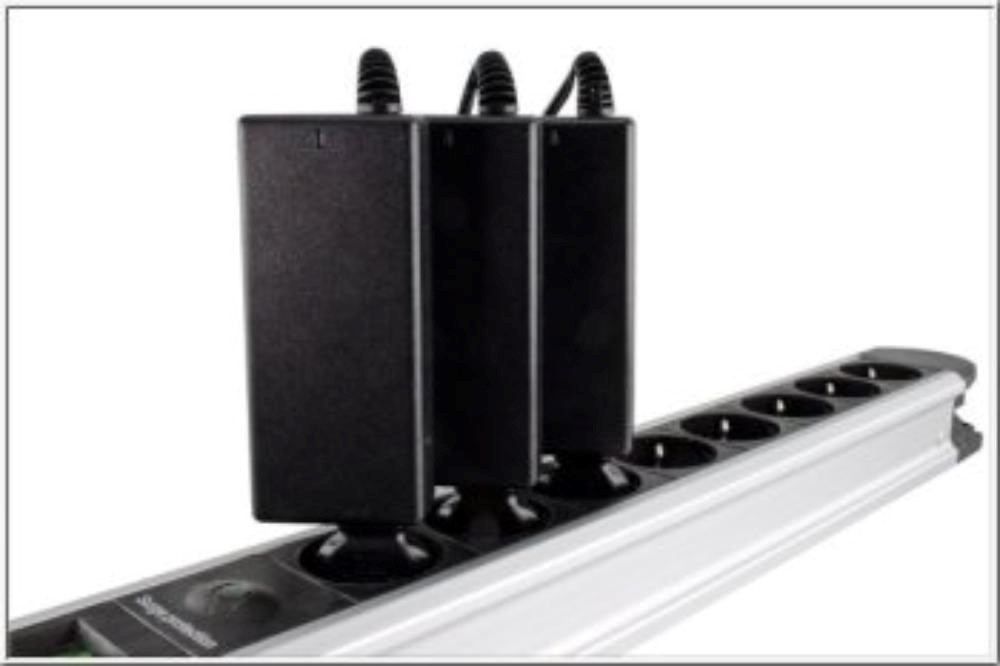 Napájací adaptér v čiernom prevedení, so vstupným konektorom CEE 7/7 a výstupným IEC C13. Výstupná zásuvka je rovná, nemeckého typu, s ochrannými plieškami po stranách, vhodná na pripojenie vidlice, ktorá je vybavená zemniacimi plieškami po stranách.