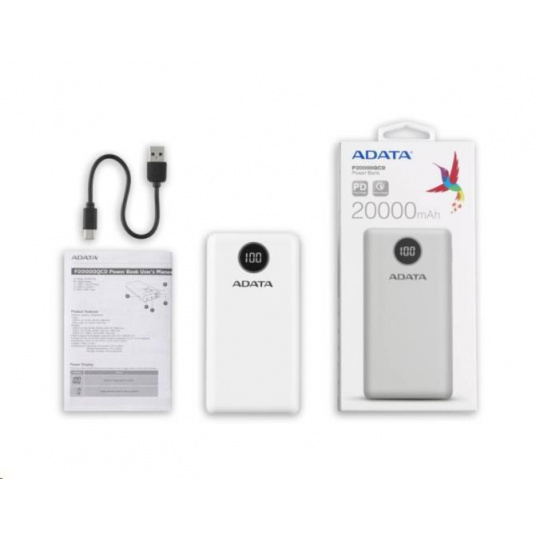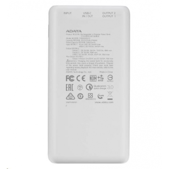 ADATA PowerBank P20000QCD - externá batéria pre mobilný telefón/tablet 20000mAh, 2,1A, biela (74Wh)