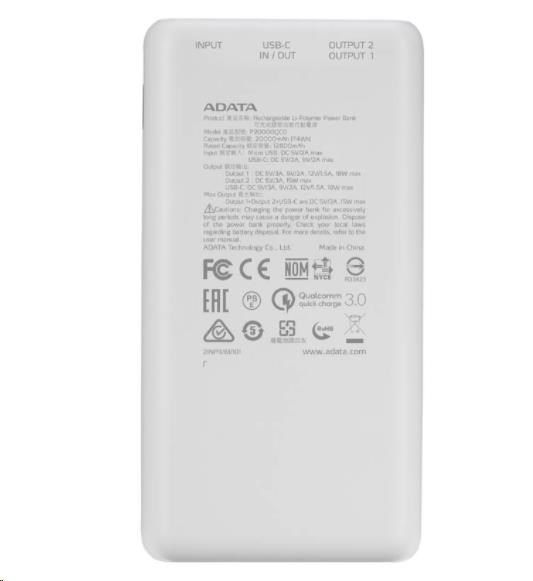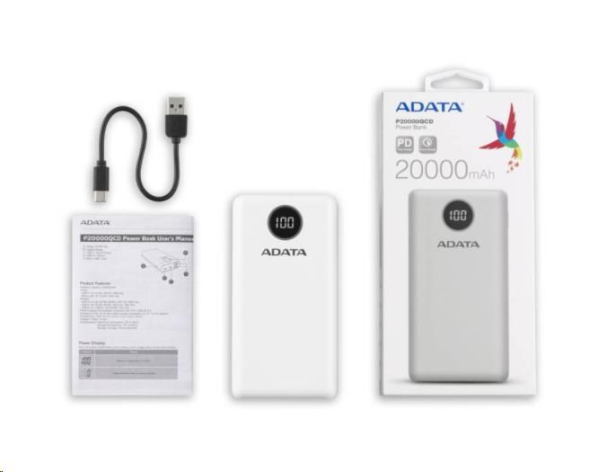 ADATA PowerBank P20000QCD - externá batéria pre mobilný telefón/tablet 20000mAh, 2,1A, biela (74Wh)