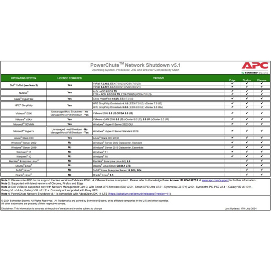 licenci na sieťové vypnutie PowerChute na 1 rok. Licenčné obdobie začína aktiváciou licencie koncovým používateľom. Jednoduchá integrácia so všetkými dodávateľmi virtualizácie a HCI. V prípade výpadku napájania umožňuje APC UPS plynulé vypnutie systému zariadení.