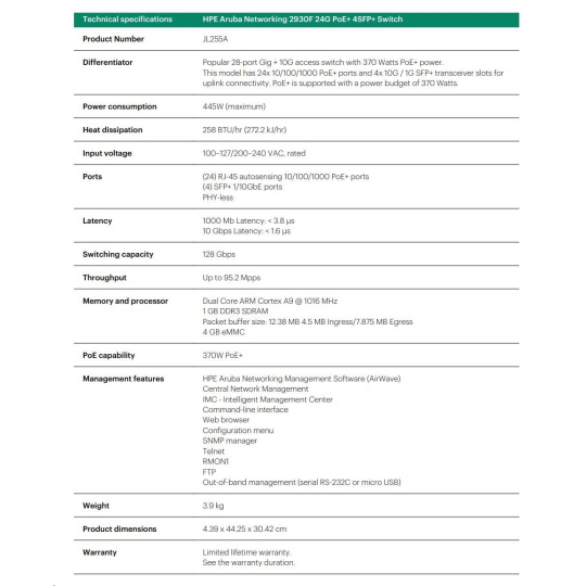 HPE Aruba Networking 2930F 24G PoE+ 4SFP+ Switch Specifications