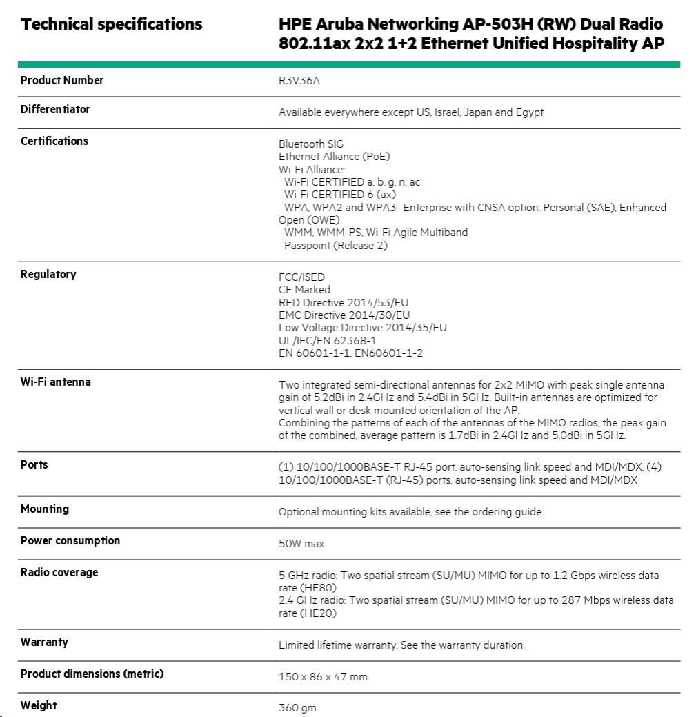 Aruba AP-503H (RW) Dual-radio 802.11ax 2x2 Unified Hospitality AP with 1+2 Ethernet R3V36AR RENEW.