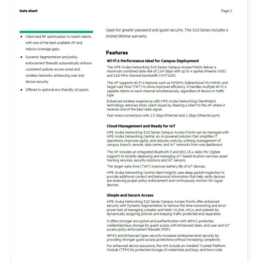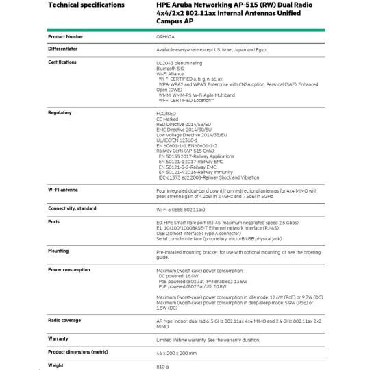 HPE Aruba Networking AP-515 (RW)AP-515 (RW) Dual Radio 4x4:4 + 2x2:2 802.11ax Internal Antennas Unified Campus AP Q9H62A