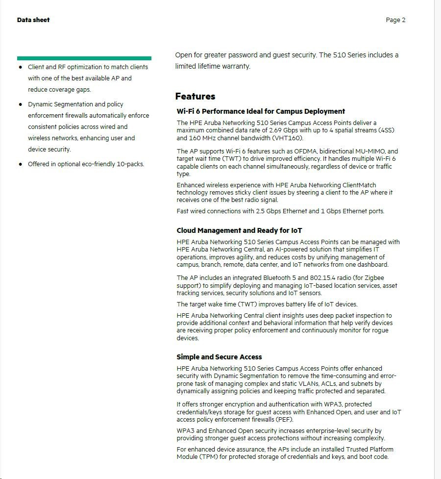 HPE Aruba Networking AP-515 (RW)AP-515 (RW) Dual Radio 4x4:4 + 2x2:2 802.11ax Internal Antennas Unified Campus AP Q9H62A