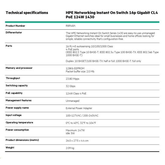 | HPE Networking Instant On Switch 16p Gigabit CL4 PoE 124W 1430 (R8R48A) | ||
