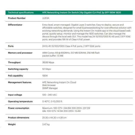 | Aruba Instant On 1830 8G Switch (JL810A) | Aruba Instant On 1830 8G 4p Class4 PoE 65W Switch (JL811A) | Aruba Instant On 1830 24G 2SFP Switch (JL812A) | Aruba Instant On 1830 24G 12p Class4 PoE 2SFP 195W Switch (JL813A) | Aruba Instant On 1830 48G 4SFP Switch (JL814A) | Aruba Instant On 1830 48G 24p Class4 PoE 4SFP 370W Switch (JL815A) | ||||