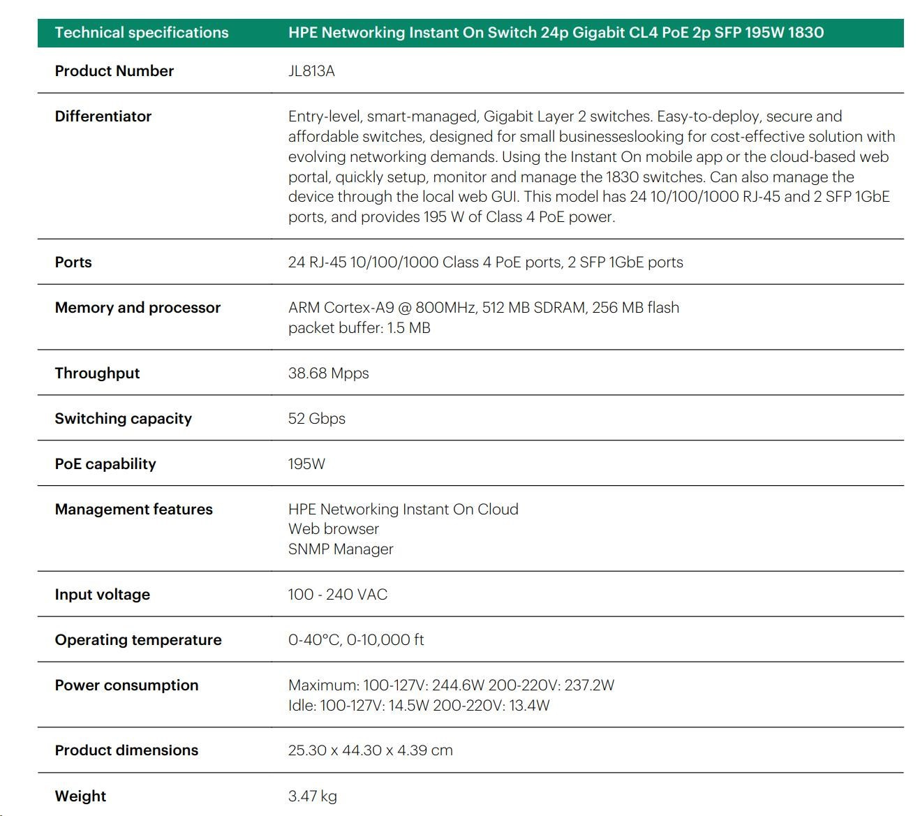 | Aruba Instant On 1830 8G Switch (JL810A) | Aruba Instant On 1830 8G 4p Class4 PoE 65W Switch (JL811A) | Aruba Instant On 1830 24G 2SFP Switch (JL812A) | Aruba Instant On 1830 24G 12p Class4 PoE 2SFP 195W Switch (JL813A) | Aruba Instant On 1830 48G 4SFP Switch (JL814A) | Aruba Instant On 1830 48G 24p Class4 PoE 4SFP 370W Switch (JL815A) | ||||