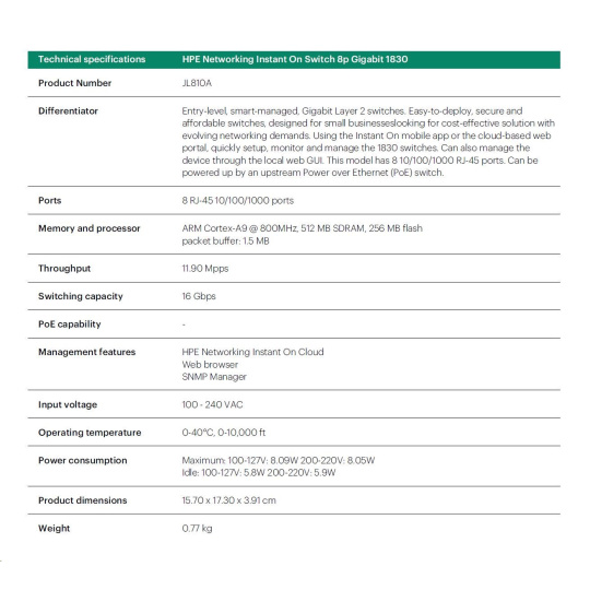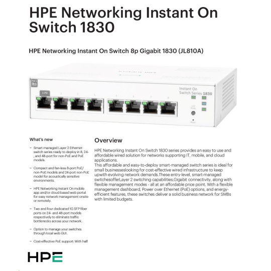 | Aruba Instant On 1830 8G Switch (JL810A) | Aruba Instant On 1830 8G 4p Class4 PoE 65W Switch (JL811A) | Aruba Instant On 1830 24G 2SFP Switch (JL812A) | Aruba Instant On 1830 24G 12p Class4 PoE 2SFP 195W Switch (JL813A) | Aruba Instant On 1830 48G 4SFP Switch (JL814A) | Aruba Instant On 1830 48G 24p Class4 PoE 4SFP 370W Switch (JL815A) | ||||