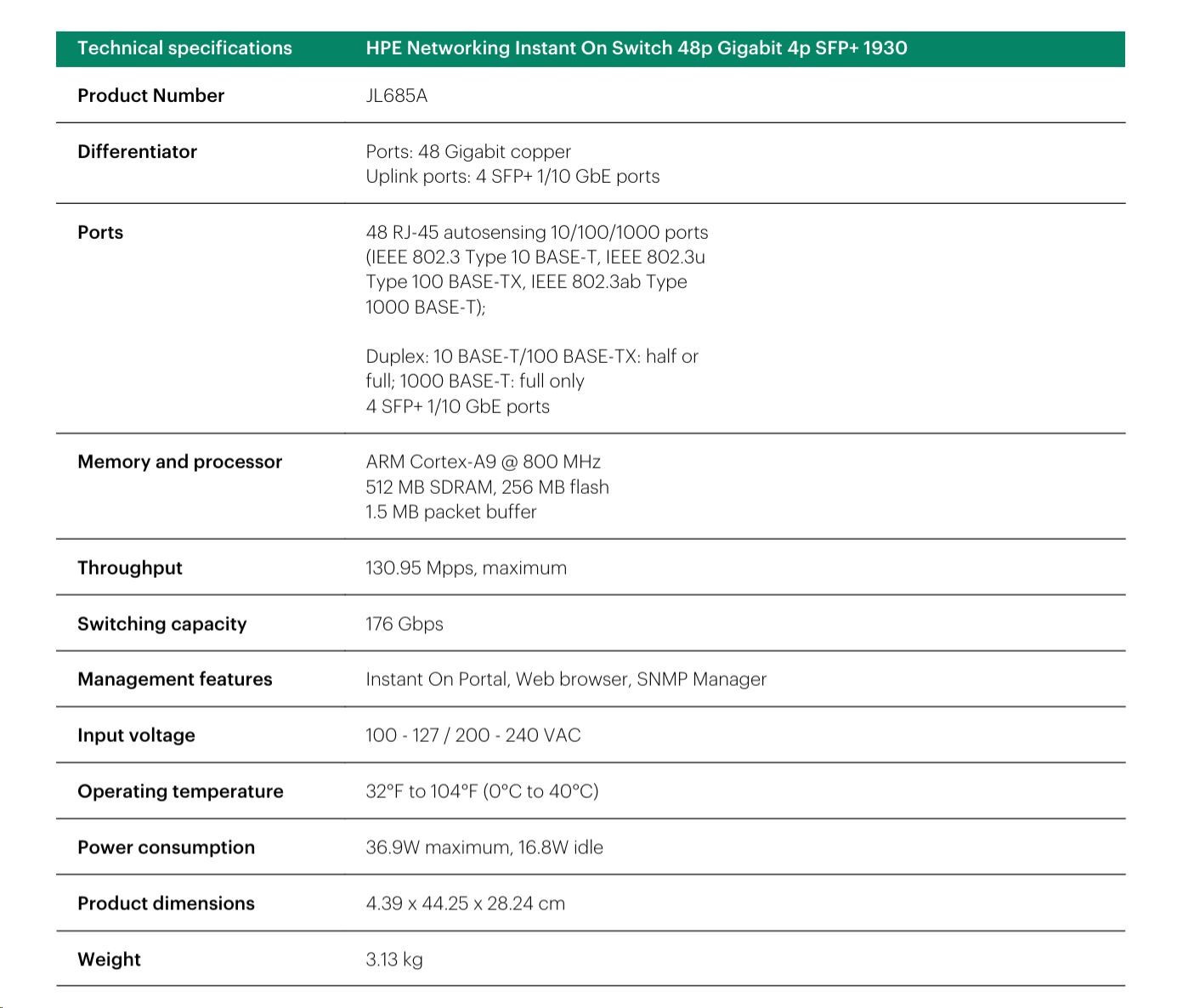HPE Networking Instant On Switch 48p Gigabit 4p SFP+ Fanless 1930 JL685A