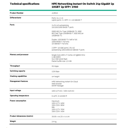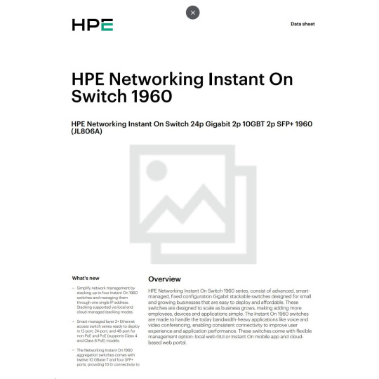 | In today's digital-first environment, small businesses face many challenges to stay afloat and competitive. With tight budgets and limited technical expertise, they're struggling to keep up with the explosion of devices and bandwidth-heavy applications running on the network. To optimize both performance and investment, small businesses need cost-effective, next-gen networking solutions. The Aruba Instant On 1960 Switch Series is an easy-to-use and affordable wired solution for networks supporting IT, mobile and cloud applications. Aruba Instant On 1960 Switches are advanced, smart-managed, fixed configuration Gigabit stackable switches designed for small and growing businesses that are easy to deploy and affordable. These switches are designed to scale as business grows, making adding more employees, devices and applications simple. Aruba Instant On 1960 switches are made to handle today's bandwidth-heavy applications like voice and video conferencing, enabling consistent connectivity to improve user experience and application performance.