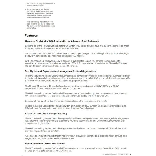 | The Instant On Differentiators The Aruba Instant On mobile app allows you to set up, manage, and monitor Instant On switches and access points directly from your phone. Within the app, you get guided step-by-step instructions to install Instant On devices to get your network up and running quickly - no technical expertise required. And cloud-based access allows you to access the network from anywhere, at any time. Cloud-Managed Stacking The Aruba Instant On mobile app and cloud-based web portal make cloud-managed stacking easy - just follow the recommendations to stack up to four (4) 1960 switches and manage as a single entity. The Instant On mobile app automatically detects members, making multiple stack members easy to setup and manage remotely. Automated configurations and streamlined workflows allow users to manage all stack members through one single dashboard without the need for device reboot. Luggage Tag Each switch has a pull-out tag, known as a luggage tag, on the front panel of the switch. The tag includes a QR code that includes switch ID information (SKU number, SKU name, serial number, and MAC address) for easy switch onboarding through Instant On mobile app. Non-Intrusive, Aesthetic Design Aruba Instant On switches are designed to complement the sleek and clean look of the Instant On access points, and to blend discreetly into your site's environment. The 8-port models, as well as the 24- and 48-port non PoE+ models, are fan-less, making them ideal for quiet office deployments. High Performance With Flexible Options The series consists of two (2) PoE switches, and two (2) non-PoE switches including 24- and 48-port Gigabit Ethernet switches with two (2) dedicated 10G SFP+ ports and two (2) 10GBASE-T uplink ports on 24-/48- port models. The series also includes a 12-port 10Gbps aggregation switch with four (4) 10G SFP+ ports to meet the bandwidth requirements of small businesses. Optimized User Experience The Aruba Instant On mobile app provides common workflows for Instant On switches and access points making it easier to configure, monitor and manage your network remotely without the need for additional hardware like cloud keys. You can also update firmware on your Instant On devices directly from the cloud whenever you want, from wherever you are. Site Inventory And Topology View The site inventory view shows all Instant On switches and access points on a single interface, and the topology view provides an intuitive structure of all Instant On devices deployed on the network - allowing you to quickly identify non-functioning devices and troubleshoot accordingly. Network issues can be easily diagnosed with connectivity tests like Ping and Traceroute. Multi-Site Remote Management The cloud-hosted web interface and mobile app make it easy to remotely manage multiple sites, multiple networks, distributed deployments and multi-tenant deployments. Each site is logically separated and has its own configuration, statistics, guest portal, and admin read/write privileges. Instant On allows you to create three admin accounts per site, offering the option to lock accounts from accidental deletion or to allow your account to be managed by a trusted partner. Built-In Security Built-in security features protect your network from external threats by blocking malware attacks and keeping unauthorized users off the network. Network traffic can be filtered and access restricted based on MAC and IP address. No Hidden Fees All features are included in the price of the hardware - there are no recurring subscription or licensing fees. Expert-level support and industry leading limited lifetime warranty are also included, along with chat support for the life of the product. |