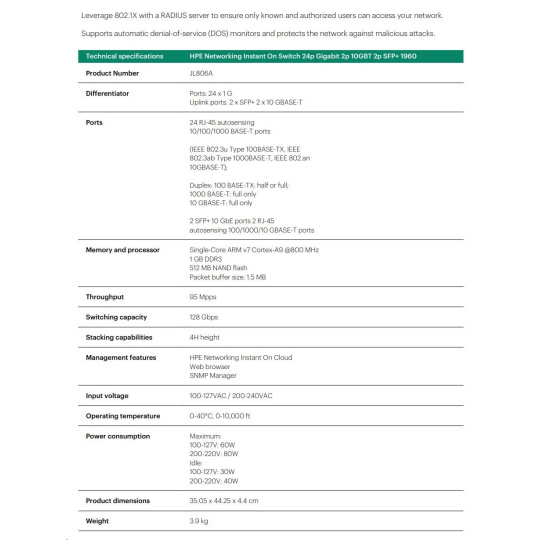 | Network Security TPM-based security Includes a Trusted Platform Module (TPM) for secure hardware-based generation and storage of cryptographic keys used for secure connection to the Instant On cloud portal.