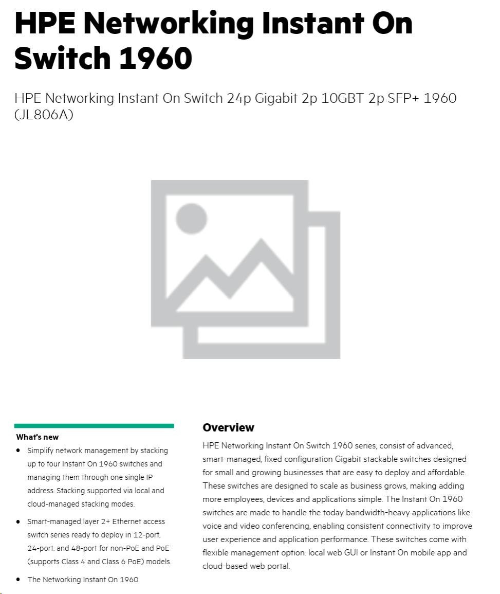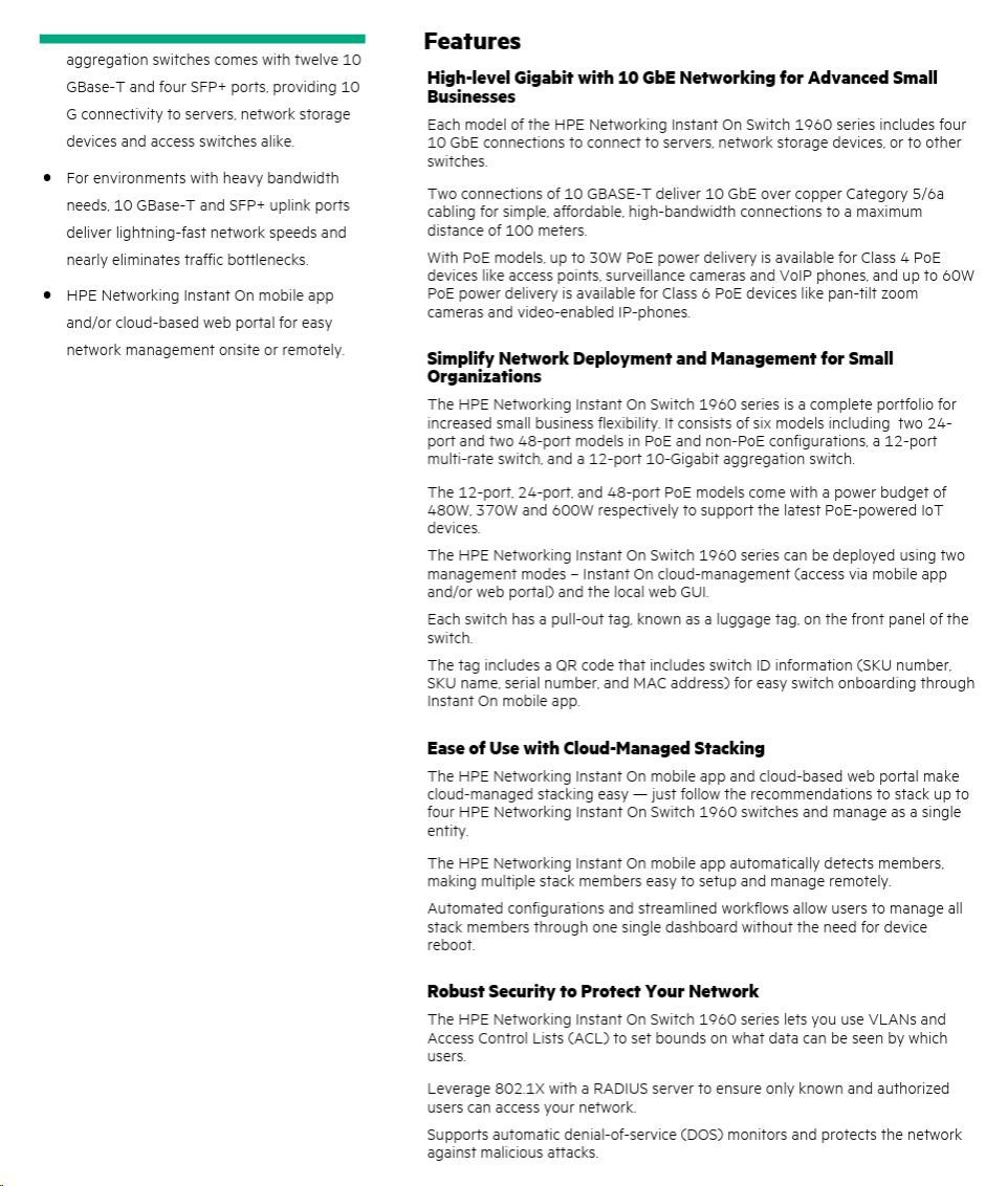 | In today's digital-first environment, small businesses face many challenges to stay afloat and competitive. With tight budgets and limited technical expertise, they're struggling to keep up with the explosion of devices and bandwidth-heavy applications running on the network. To optimize both performance and investment, small businesses need cost-effective, next-gen networking solutions. The Aruba Instant On 1960 Switch Series is an easy-to-use and affordable wired solution for networks supporting IT, mobile and cloud applications. Aruba Instant On 1960 Switches are advanced, smart-managed, fixed configuration Gigabit stackable switches designed for small and growing businesses that are easy to deploy and affordable. These switches are designed to scale as business grows, making adding more employees, devices and applications simple. Aruba Instant On 1960 switches are made to handle today's bandwidth-heavy applications like voice and video conferencing, enabling consistent connectivity to improve user experience and application performance.