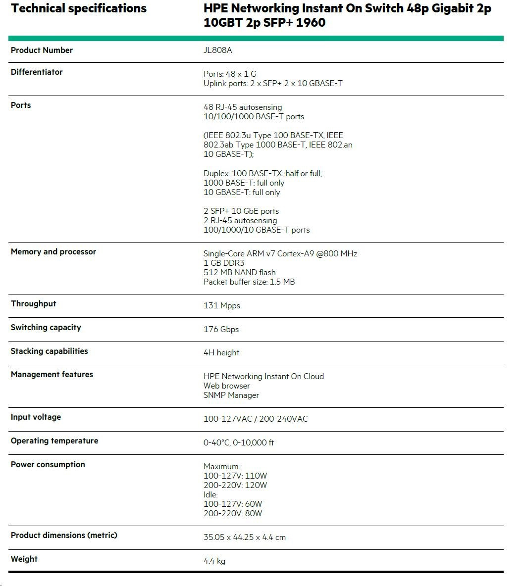 HPE Networking Instant On Switch 48p Gigabit 2p 10GBT 2p SFP+ 1960 (JL808A)