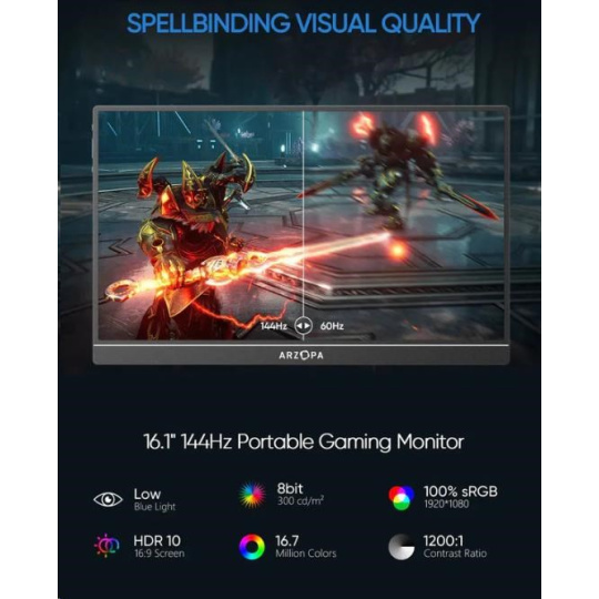 Arzopa Z1RC je přenosný monitor, který kombinuje vynikající kvalitu obrazu s kompaktním designem. Jeho 16" obrazovka nabízí rozlišení 2560 x 1600 p s obnovovací frekvencí 60 Hz, díky čemuž si můžete vychutnat dynamický obraz s bohatými detaily. Je kompatibilní se širokou škálou zařízení a díky možnosti zobrazovat obraz na výšku i na šířku jej přizpůsobíte svým preferencím. Snadno se vám vejde do tašky nebo batohu a poskytne vám možnost pracovat nebo se bavit kdekoli.