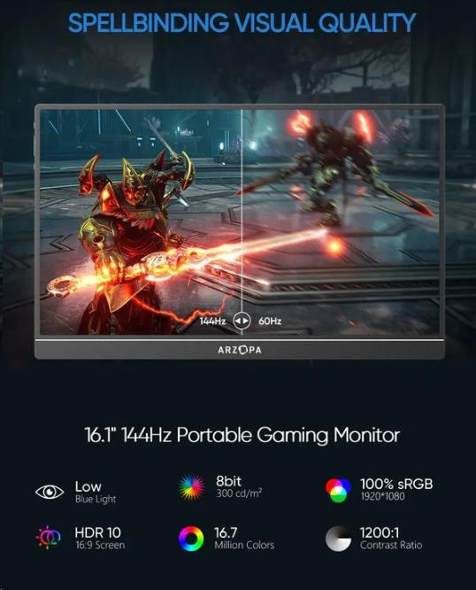 Arzopa Z1RC je přenosný monitor, který kombinuje vynikající kvalitu obrazu s kompaktním designem. Jeho 16" obrazovka nabízí rozlišení 2560 x 1600 p s obnovovací frekvencí 60 Hz, díky čemuž si můžete vychutnat dynamický obraz s bohatými detaily. Je kompatibilní se širokou škálou zařízení a díky možnosti zobrazovat obraz na výšku i na šířku jej přizpůsobíte svým preferencím. Snadno se vám vejde do tašky nebo batohu a poskytne vám možnost pracovat nebo se bavit kdekoli.