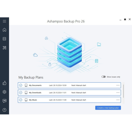 Ashampoo Backup Pro 26 vás zbaví strachu z vírusov, ransomvéru a hardvérových chýb! Vyskúšajte ľahko použiteľné, dobre navrhnuté a zároveň výkonné riešenie zálohovania. Nový Ashampoo Backup Pro vám ponúka všetky možné možnosti ukladania: Zálohujte jednotlivé súbory alebo celé oddiely na lokálne disky alebo u poskytovateľov online úložísk. Zálohovací softvér nemôže byť jednoduchší. Stačí zapojiť úložné zariadenie a môžete začať! Okrem toho je program efektívny z hľadiska zdrojov, neprekáža vám a všetku ťažkú prácu vykonáva na pozadí. Obnovenie záloh je veľmi jednoduché! Ashampoo Backup Pro dokonca prichádza so systémom záchrany pri spustení na obnovenie systému v prípade závažného zlyhania systému!