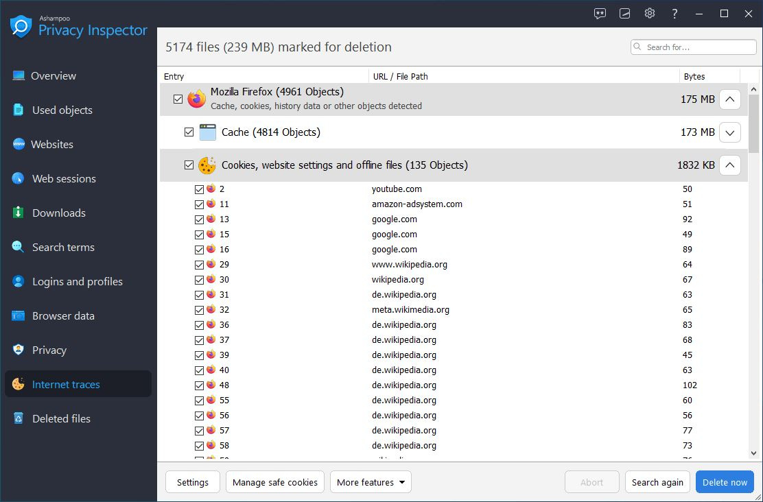Na anonymné prehliadanie webu môžete používať blokátory reklám, VPN a iné prostriedky, ale stále zanechávate v počítači jasné stopy hľadaných výrazov, písania formulárov a navštívených webových stránok! Pomocou aplikácie Ashampoo Privacy Inspector môžete skontrolovať nielen svoje stopy, ale aj stopy všetkých ostatných používateľov vášho počítača. Pomocou filtrov sa môžete sústrediť na to, čo je pre vás dôležité, jednoducho prechádzajte dátami z prehliadačov Chrome, Edge a Firefox a odstráňte všetko, čo nechcete nahrávať!