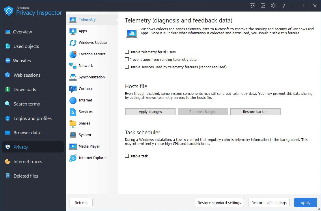 Ashampoo Privacy Inspector obsahuje všetko, čo potrebujete na obmedzenie nadmerného zhromažďovania údajov systémom Windows. Vypnite telemetriu a lokalizačné služby, vypnite synchronizáciu hesiel a vypnite Cortanu. A ak používate tablet na používanie rukopisu v systéme Windows, možno vás bude zaujímať, že systém Windows odosiela aj vzorky rukopisu, takže nezabudnite vypnúť aj túto funkciu! Stačí pár kliknutí.