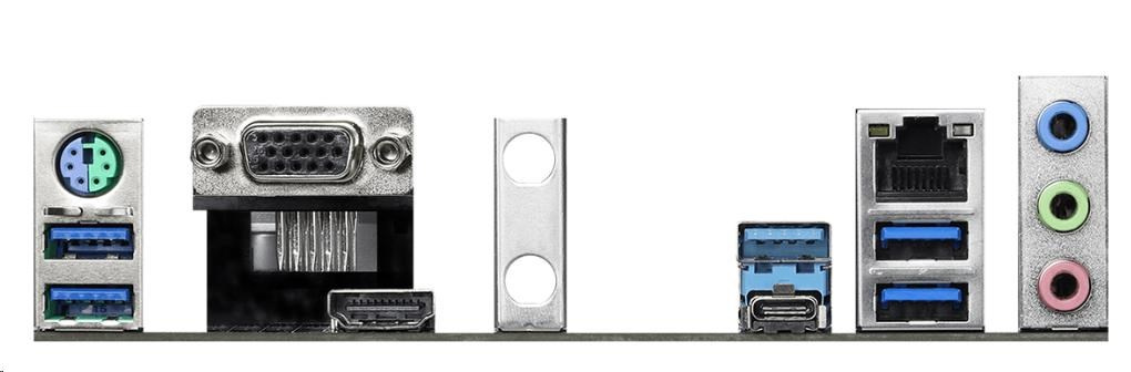 | Vstupy/výstupy na zadnom paneli | - Držiak antény - 1 x port PS/2 pre myš/klávesnicu - 1 x port D-Sub - 1 x port HDMI - 1 x USB 3.2 port typu A Gen2 (10 Gb/s) (podporuje ochranu proti prepätiu) - 1 x USB 3.2 Gen2 port typu C (10 Gb/s) (podporuje ochranu proti ESD) - 4 x USB 3.2 porty Gen1 (podporuje ochranu proti ESD) - 1 x port RJ-45 LAN s LED diódou (ACT/LINK LED a SPEED LED) - HD audio konektory: Line in / Predný reproduktor / Mikrofón |