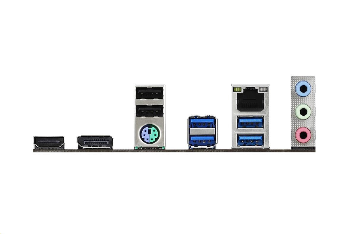 | vstupy/výstupy na zadnom paneli | - 1 x port PS/2 pre myš/klávesnicu - 1 x port HDMI - 1 x DisplayPort 1.4 - 4 x USB 3.2 porty Gen1 (podporuje ochranu proti ESD) - 2 x USB 2.0 portov (podporuje ochranu proti ESD) - 1 x RJ-45 LAN port s LED diódou (ACT/LINK LED a SPEED LED) - HD audio konektory: Line in / Front Speaker / Microphone |