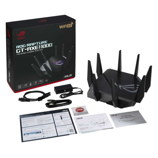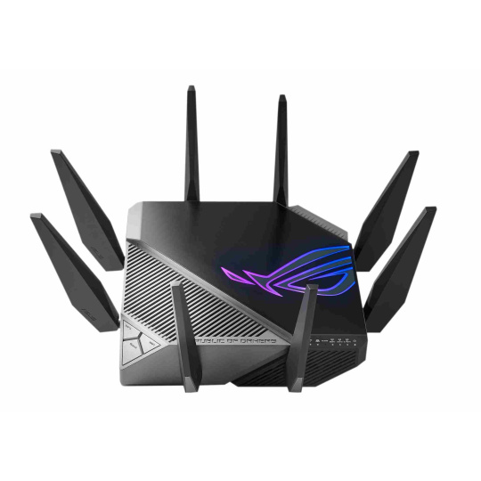 ROG Rapture GT-AXE11000 Trojpásmový herný router GT-AXE11000 WiFi 6E (802.11ax), nové pásmo 6 GHz, 2.port 5G WAN/LAN, kompatibilita s PS5, agregácia WAN, VPN Fusion, trojúrovňová akcelerácia hier, bezplatné zabezpečenie siete a podpora AiMesh Štandard WiFi novej generácie - prvý trojpásmový router WiFi 6E na svete zvyšuje rýchlosť až na 11 000 Mb/s. Nové pásmo 6 GHz - širšie kanály a vyššia kapacita prinášajú vyšší výkon, nižšiu latenciu a menej rušenia. 2.5G WAN/LAN Port - Všetka sieťová prevádzka prechádzajúca cez 2.port 5G má najvyššiu prioritu a 2.port 5G tak môže naplno využiť potenciál WiFi 6. Výkon vďaka špičkovej technológii - štvorjadrový procesor, pokročilý systém chladenia a optimalizovaný dizajn antény posúvajú výpočtové možnosti na úplne novú úroveň. Trojúrovňová akcelerácia hry - zrýchlenie herných dát na každej zastávke od zariadenia až po herný server. RJ45 pre Gigabits BaseT pre WAN x 1, RJ45 pre Gigabits BaseT pre LAN x 4, RJ45 pre 2.5G BaseT pre WAN/LAN x 1 ROG Rapture Wifi 6 802.11ax Trojpásmový gigabitový herný router Wifi 6 802.11ax 1148Mbps (2.4G) Wifi 6 802.11ax 4804Mbps (5GHz) Wifi 6E 802.11ax 4804Mbps (6GHz) OFDMA + MU-MIMO, 1024 QAM, trojúrovňová akcelerácia hier, osvetlenie Aura RGB, ROG Boost Key, 2.5G Multi-Gigabit Gaming Port, WiFI Radar a Zero Wait DFS, AiProtection Pro, VPN Fusion Adaptive QoS, Bandwidth control, AiMesh, ASUS Roter APP (ROG theme)..