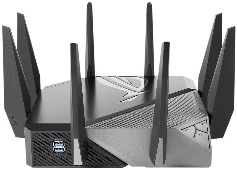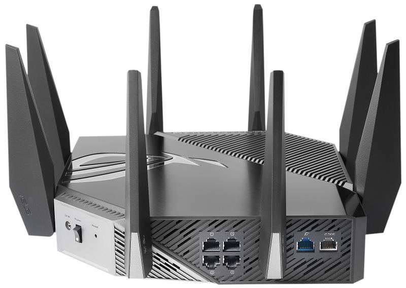 ROG Rapture GT-AXE11000 Trojpásmový herný router GT-AXE11000 WiFi 6E (802.11ax), nové pásmo 6 GHz, 2.port 5G WAN/LAN, kompatibilita s PS5, agregácia WAN, VPN Fusion, trojúrovňová akcelerácia hier, bezplatné zabezpečenie siete a podpora AiMesh Štandard WiFi novej generácie - prvý trojpásmový router WiFi 6E na svete zvyšuje rýchlosť až na 11 000 Mb/s. Nové pásmo 6 GHz - širšie kanály a vyššia kapacita prinášajú vyšší výkon, nižšiu latenciu a menej rušenia. 2.5G WAN/LAN Port - Všetka sieťová prevádzka prechádzajúca cez 2.port 5G má najvyššiu prioritu a 2.port 5G tak môže naplno využiť potenciál WiFi 6. Výkon vďaka špičkovej technológii - štvorjadrový procesor, pokročilý systém chladenia a optimalizovaný dizajn antény posúvajú výpočtové možnosti na úplne novú úroveň. Trojúrovňová akcelerácia hry - zrýchlenie herných dát na každej zastávke od zariadenia až po herný server. RJ45 pre Gigabits BaseT pre WAN x 1, RJ45 pre Gigabits BaseT pre LAN x 4, RJ45 pre 2.5G BaseT pre WAN/LAN x 1 ROG Rapture Wifi 6 802.11ax Trojpásmový gigabitový herný router Wifi 6 802.11ax 1148Mbps (2.4G) Wifi 6 802.11ax 4804Mbps (5GHz) Wifi 6E 802.11ax 4804Mbps (6GHz) OFDMA + MU-MIMO, 1024 QAM, trojúrovňová akcelerácia hier, osvetlenie Aura RGB, ROG Boost Key, 2.5G Multi-Gigabit Gaming Port, WiFI Radar a Zero Wait DFS, AiProtection Pro, VPN Fusion Adaptive QoS, Bandwidth control, AiMesh, ASUS Roter APP (ROG theme)..