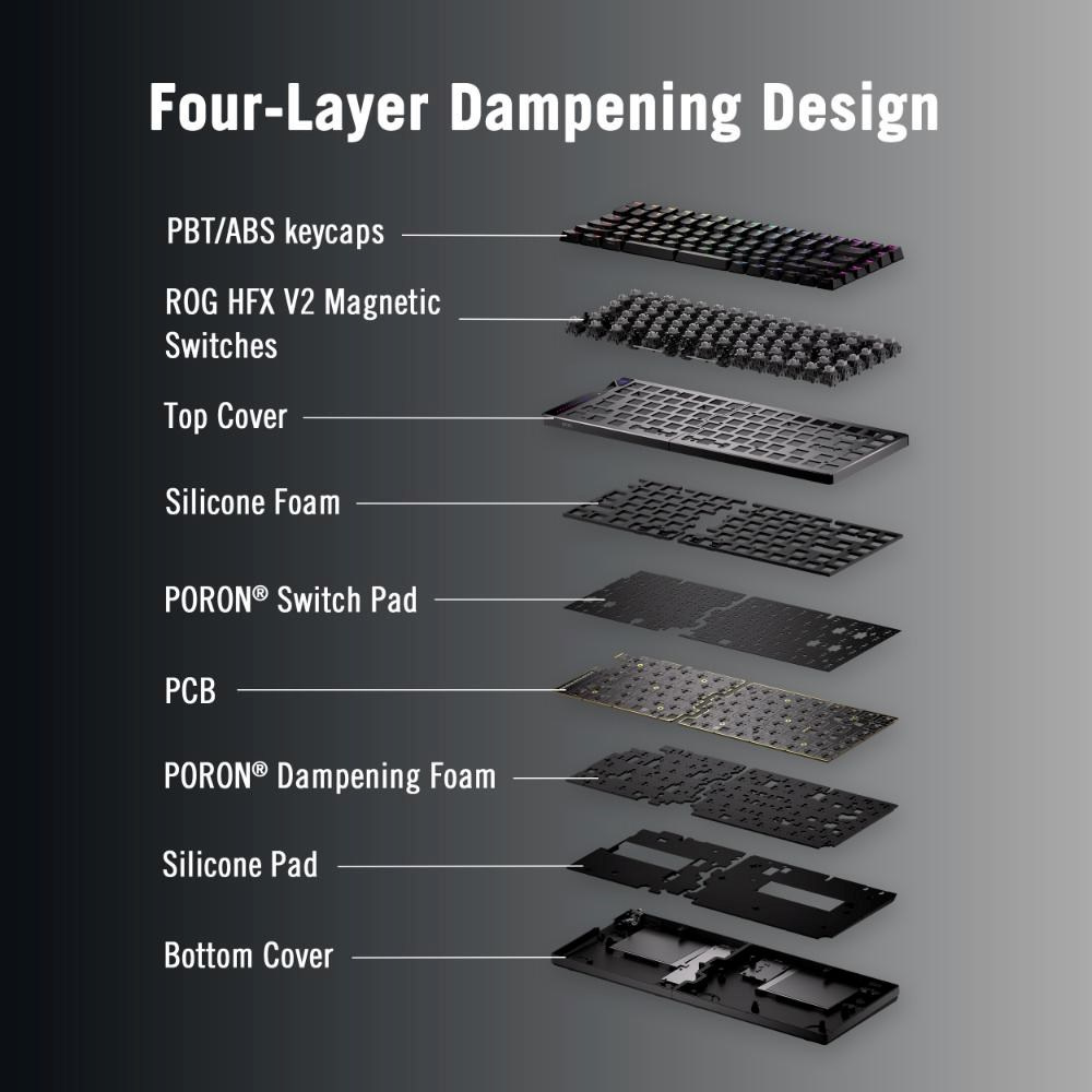 - Magnetický spínač ROG HFX V2 s možnosťou výmeny počas prevádzky: Vylepšené stlačenia kláves s nastaviteľnou aktiváciou 0,1–3,5 mm a presným ladením v krokoch po 0,01 mm