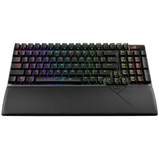 Bezdrôtová herná klávesnica ROG Strix Scope II 96 s pripojením v troch režimoch, klávesové skratky pre streamovanie, multifunkčné ovládacie prvky, mechanické spínače ROG NX s možnosťou výmeny za prevádzky, stabilizátory klávesnice ROG, krytky kláves PBT doubleshot a silikónová tlmiaca pena, tri uhly sklonu a opierka zápästia