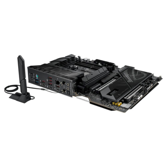 AMD X870E (AM5 Socket) ATX motherboard, Advanced AI PC-ready, 18+2+2 power stages, Dynamic OC Switcher, Core Flex, DDR5 slots with AEMP, ROG Memory Fan Kit for DDR5 overclocking, Wi-Fi 7 with ASUS WiFi Q-Antenna, three PCIe 5.0 M.2 slots onboard, two PCIe 4.0 slots on an ROG DIMM.2 card, PCIe 5.0 x16 SafeSlots with PCIe Slot Q-Release Slim and full support for next-gen graphics cards, two USB4 ports, two USB 20Gbps Type-C front-panel connectors (one with Quick Charge 4+ up to 60W and USB Wattage Watcher), AI Overclocking, AI Cooling II, and AI Networking II