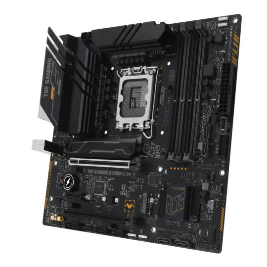 TUF GAMING B760M-E D4 takes all the essential elements of the latest Intel® processors and combines them with game-ready features and proven durability. Engineered with military-grade components, an upgraded power solution and a comprehensive cooling system, this motherboard goes beyond expectations with rock-solid performance for marathon gaming. TUF GAMING motherboards also undergo rigorous endurance testing to ensure that they can handle conditions where others may fail. Aesthetically, this model incorporates an embossed nameplate and geometric design elements to reflect the dependability and stability that defines the TUF GAMING series.