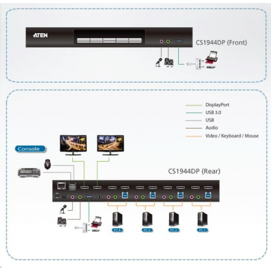Prepínač KVM ATEN CS1944DP vám pomôže zorganizovať pracovnú plochu. Najmä pri správe multimediálnej pracovnej stanice vo veľkej organizácii ponúka CS1944DP používateľom okamžitý prístup k štyrom počítačom,