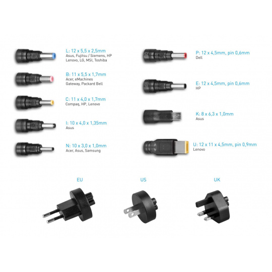 Univerzálny nabíjací adaptér AVACOM QuickTIP 45 W pre notebooky s 9 rôznymi konektormi dokáže napájať prevažnú väčšinu notebookov obľúbených značiek, ako sú Acer, Asus, Compaq, Dell, Fujitsu/Siemens, Gateway, HP, LG, Lenovo, MSI, Packard Bell, Samsung, Toshiba, eMachines a ďalšie zariadenia vyžadujúce sieťové napájanie.