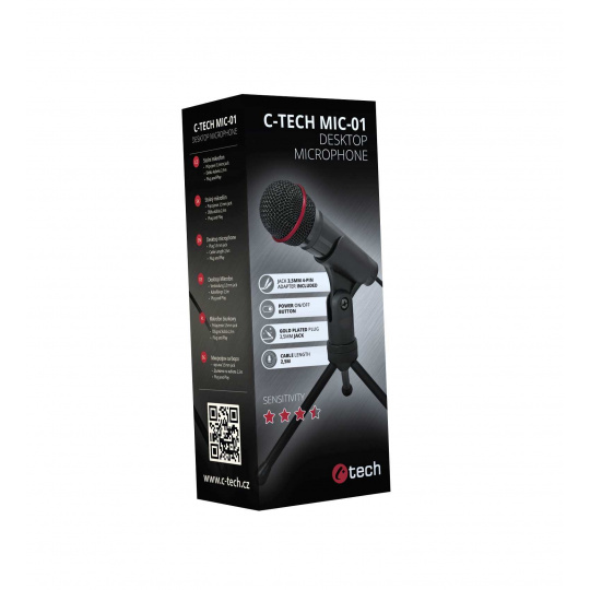 C-TECH MIC-01 je vysokokvalitný mikrofón s prirodzenou kvalitou reprodukcie hlasu na každodenné použitie. Je vhodný na používanie s komunikačnými programami, ako aj na vytváranie videí na YouTube alebo živých prenosov. Mikrofón sa pripája pomocou 2,5 m kábla s pozláteným 3,5 mm stereo jack konektorom, ale súčasťou balenia je aj stereo redukcia 3-pin/4-pin jack na pripojenie mikrofónu k zariadeniu, ktoré má kombinovaný zvukový konektor pre mikrofón a slúchadlá. Mikrofón je vybavený tlačidlom ON/OFF. V balení nájdete praktický statív, vďaka ktorému môžete mikrofón umiestniť do rôznych polôh.