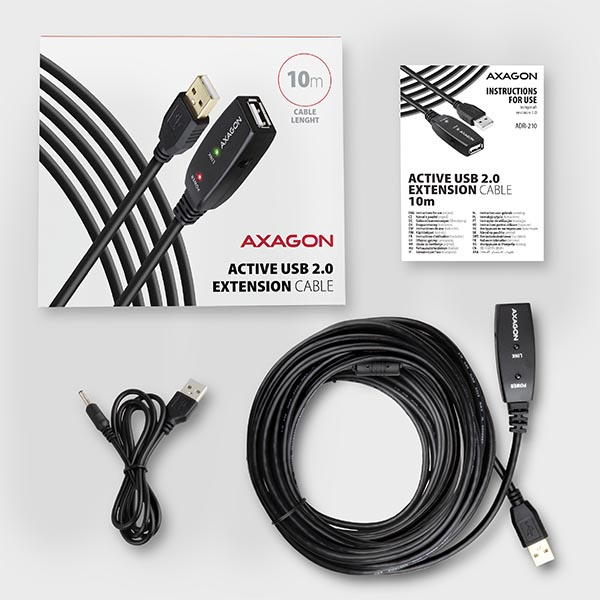Aktívny predlžovací USB 2.0 kábel AXAGON ADR-210 dĺžky 10 metrov.