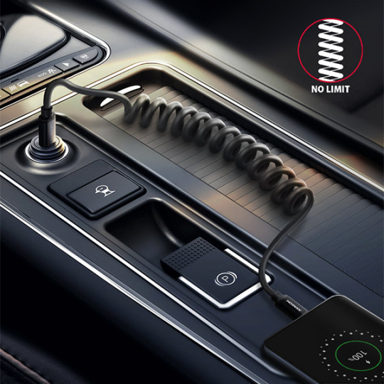 Odolný dátový a napájací kábel s predĺženou životnosťou má kovové koncovky, poniklované konektory a pozlátené kontakty. Vodiče kábla sú vyrobené z pocínovanej bezkyslíkatej medi. Vysokokvalitná izolácia kábla vyrobená z pružného TPE zaručuje maximálnu odolnosť, ale zároveň si zachováva dostatočnú flexibilitu. Vďaka svojej skrútenej a zaťahovacej konštrukcii zaberá kábel minimum miesta, a preto je ideálnym príslušenstvom do auta. V skrátenom stave je kábel dlhý len 35 cm a nikde neprekáža. Po vysunutí pohodlne dosiahne 60 cm od zásuvky.