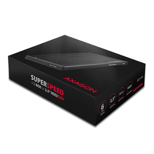 Kompaktný hliníkový externý box AXAGON EE25-XA6 ALINEbox s USB 3.2 Gen 1 (USB 3.0) rozhraním určený pre 2.5" SATA pevné disky alebo SSD.