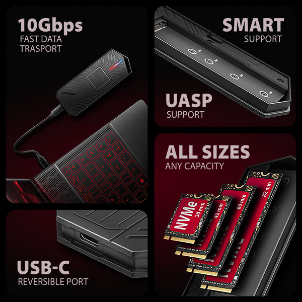 Unikátnou vlastnosťou vďaka použitému čipsetu je možnosť používať M.2 NVMe aj SATA disky. Nemusíte teda premýšľať o tom, aký typ disku M.2 vložiť do krabice. Výhodou je, že ho možno pripevniť na štyri rôzne dĺžky SSD kariet – 30, 42, 60 a 80 mm. Karty M.2 môžu byť jednostranné alebo obojstranné. Box nemá žiadny kapacitný limit pre vložený SSD.