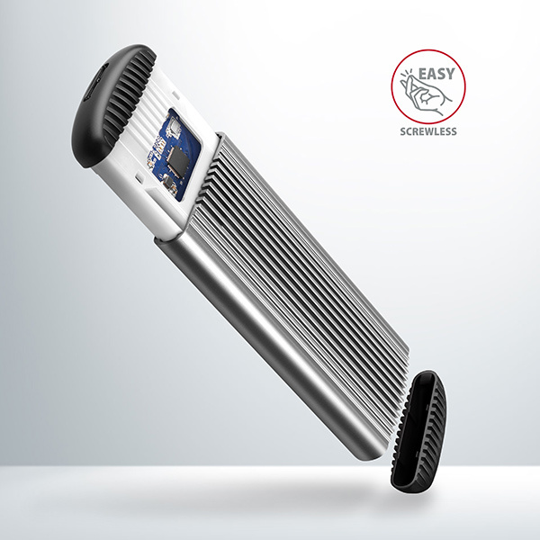 Bezskrutkové otváranie skrinky uľahčuje montáž a demontáž zariadenia M.2 disky SSD. Výmena diskov je rýchla a jednoduchá, čím sa rozširujú možnosti používania boxu, napr. na migráciu údajov, testovanie atď.