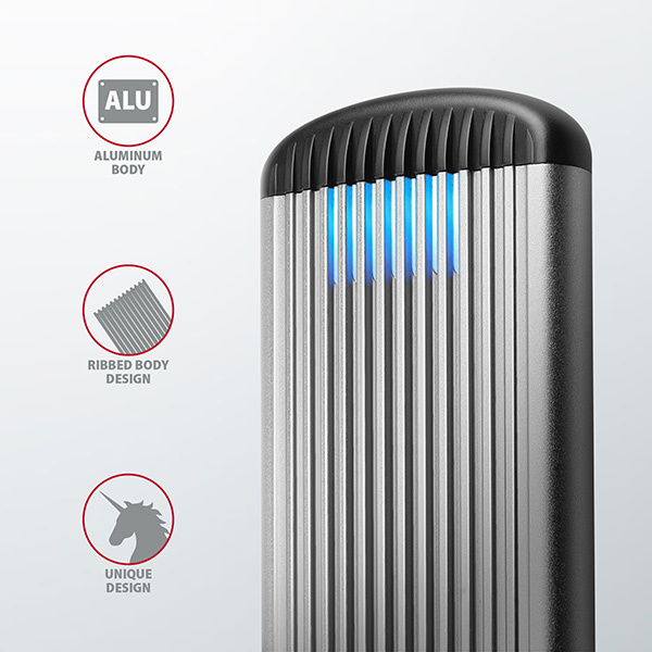 Rebrovaná konštrukcia tela a kovový plášť skrinky zabezpečujú veľmi dobré chladenie vloženého zariadenia M.2 disky SSD. Tým sa predlžuje životnosť disku a zabraňuje sa aj spomaľovaniu rýchlosti disku. "Thermal Throttling". Robustné telo skrinky zabezpečuje aj dostatočnú ochranu jednotky.