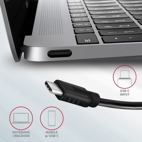 - Výkonné nabíjanie mobilných zariadení prúdom až do 3A pri 5V v portoch USB-C rozbočovača.